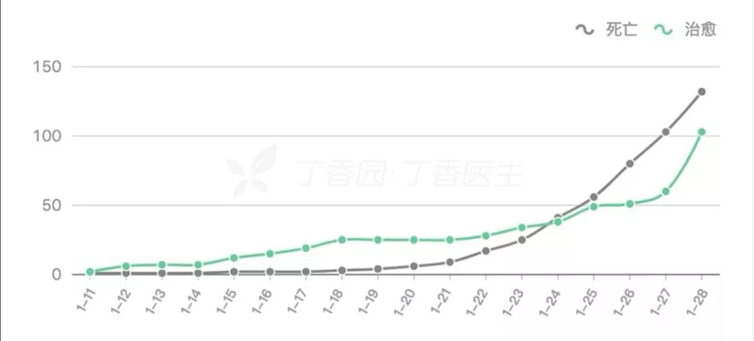 还有一项数据值得关注,死亡人数和治愈人数的比较数据。由下图可以看出,死亡人数近几日在持续增加中,但增加数量相对稳定。从1月28日开始,治愈人数开始快速增加,预计治愈人数在接下来会快速增长,但考虑到重症人数现在还有1370例并持续增加中,死亡人数接下来也还会持续增加,但总体死亡率会随着我们对病毒的掌控力增加而不断下降。